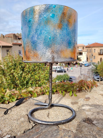 Lampe de couleur orange/bleu avec des bulles turquoise en relief ainsi qu'une poudre satinée beige. Sablé au dos.