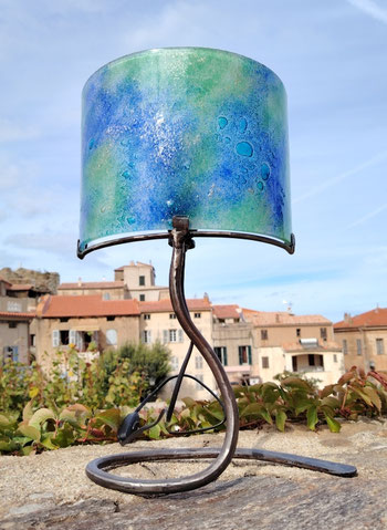 Lampe de couleur bleu/vert avec bulles bleue verte en relief ainsi qu'une poudre satinée beige. Sablé au dos.